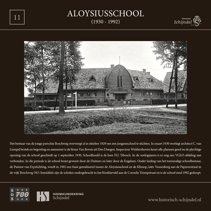 Het bestuur van de jonge parochie Boschweg overweegt al in oktober 1929 om een jongensschool te stichten. In maart 1930 overlegt architect C. van Liempd bestek en begroting en aannemer is de firma Van Boven uit Den Dungen. Inspecteur Widdershoven keurt alle plannen goed en de plechtige opening van de school geschiedt op 1 september 1930. Schoolhoofd is de heer H.J. Tibosch. In de oorlogsjaren is er nog een VGLO-afdeling aan verbonden. In die periode is de school bezet geweest door de Duitsers en later door de Engelsen. Onder leiding van het toenmalige schoolbestuur, de Pastoor van Erpstichting, wordt in 1992 een fusie gerealiseerd tussen de Aloysiusschool en de Klimop, later Vossenberg aan de Papaverstraat in de wijk Boschweg-NO. Inmiddels zijn de scholen ondergebracht in het Kwekkeveld aan de Cornelis Trompstraat en de school is eind 1992 gesloopt.